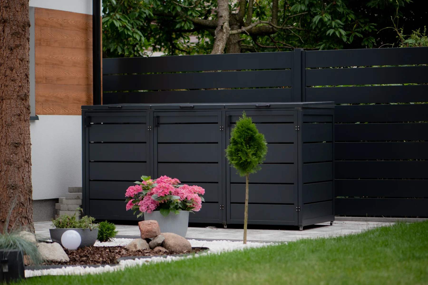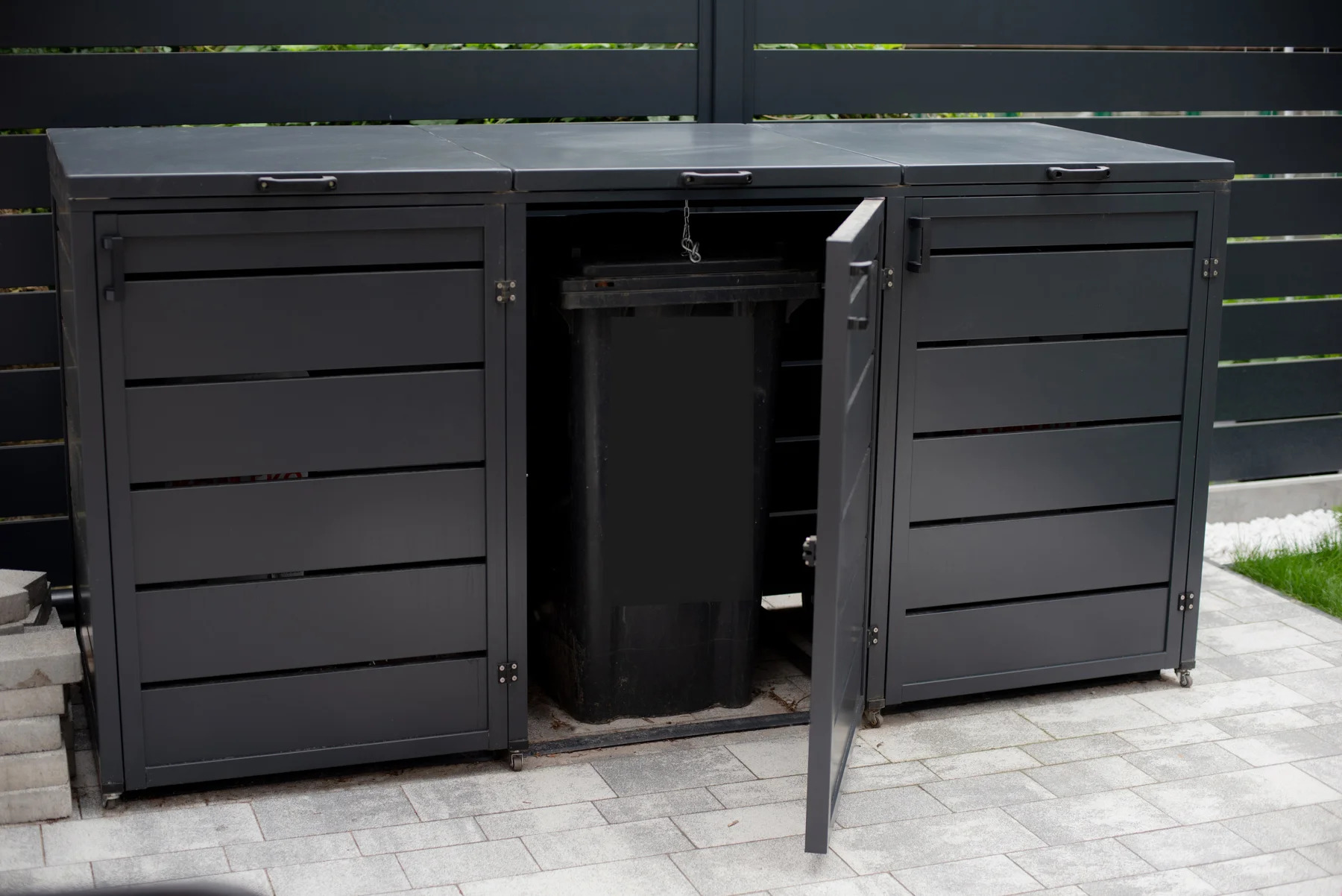 ZABUDOWA KOSZY NA ODPADY dedykowana jest głównie dla prywatnych gospodarstw domowych. Idealnie wkomponowuje się w ogrodzenie aluminiowe, tworząc wspólnie wizualną całość. To praktyczne i funkcjonalne rozwiązanie, pozwalające na ukrycie nieestetycznych pojemników na śmieci oraz redukcję nieprzyjemnych zapachów. Nowoczesna zabudowa do koszy na odpady to sposób na utrzymanie harmonii i porządku.
